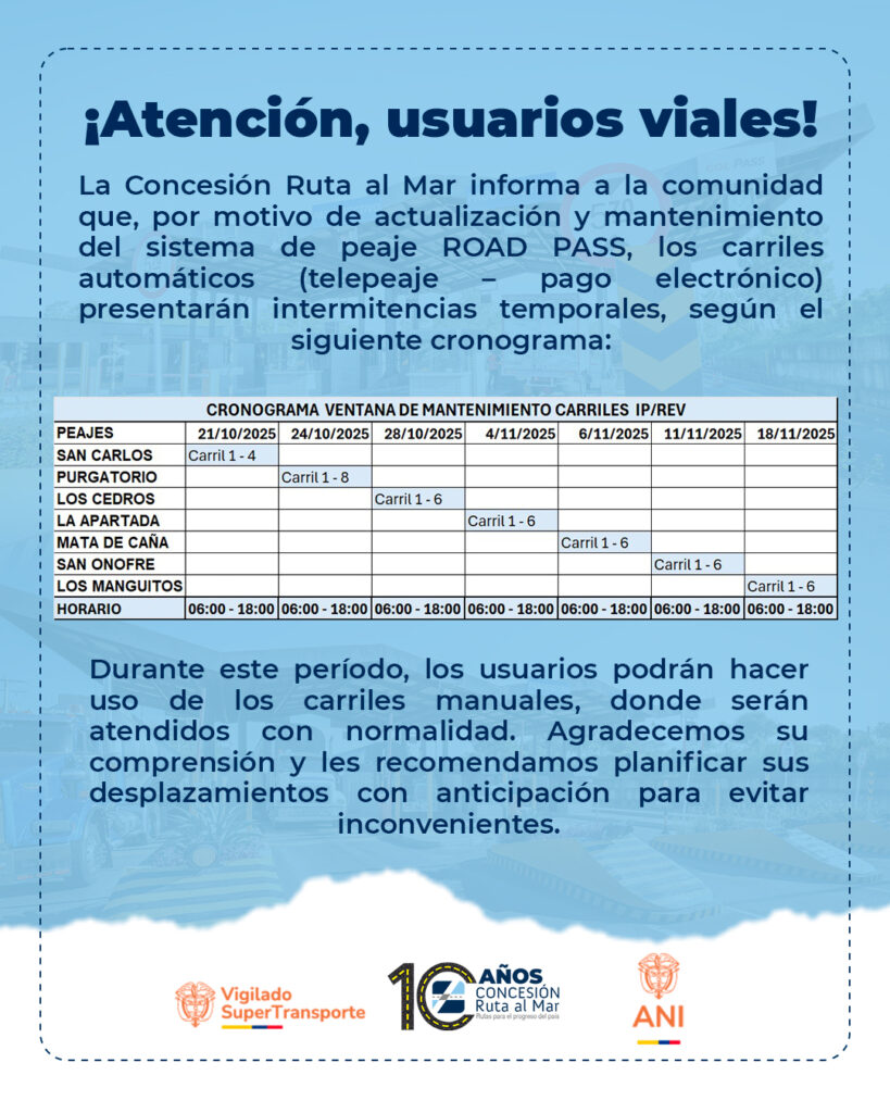 🚧 Durante este periodo, los usuarios podrán hacer uso de los carriles manuales, donde serán atendidos con normalidad.